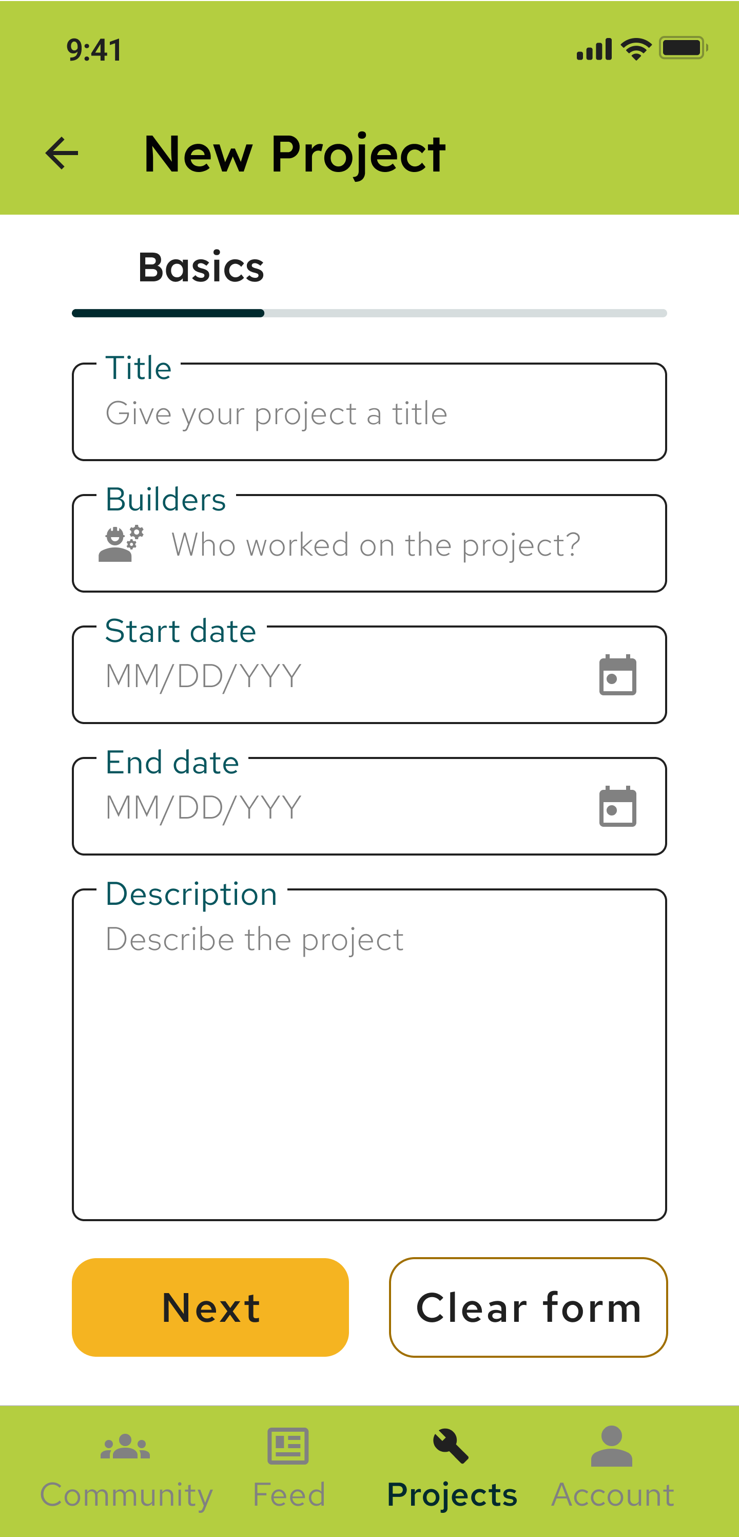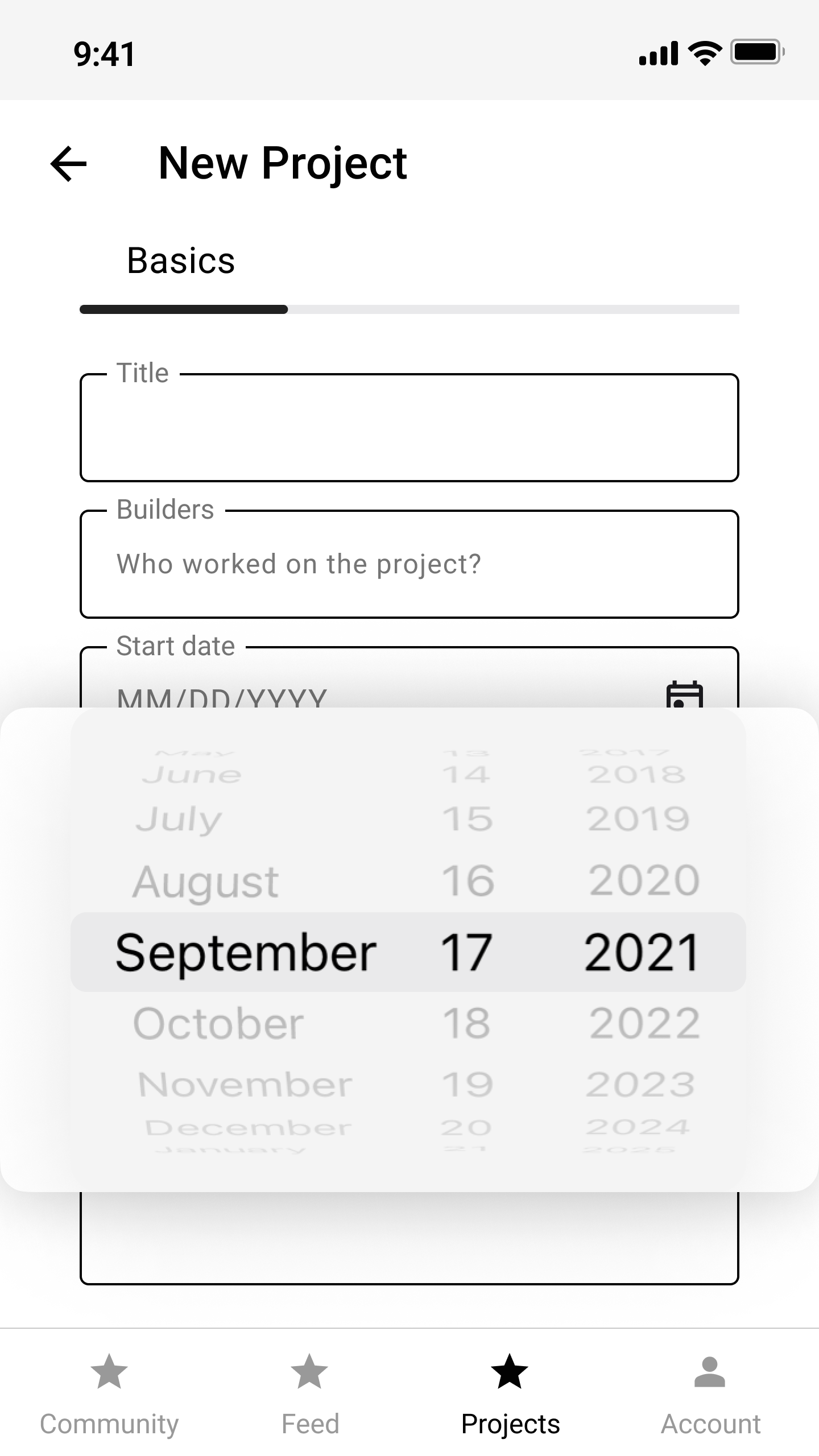 For the mid-fidelity wireframes, I spread out the New Project input fields over three screens, and incorporated a progression tracker to keep the user informed