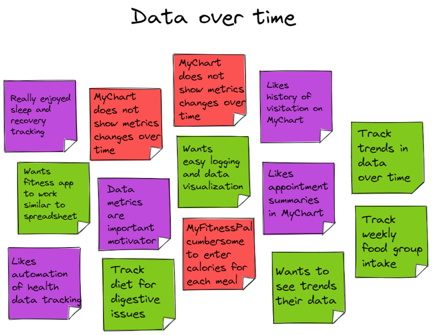 Users need to record and access their health data, analyze their health data, and view their health data through time and other relevant axes.