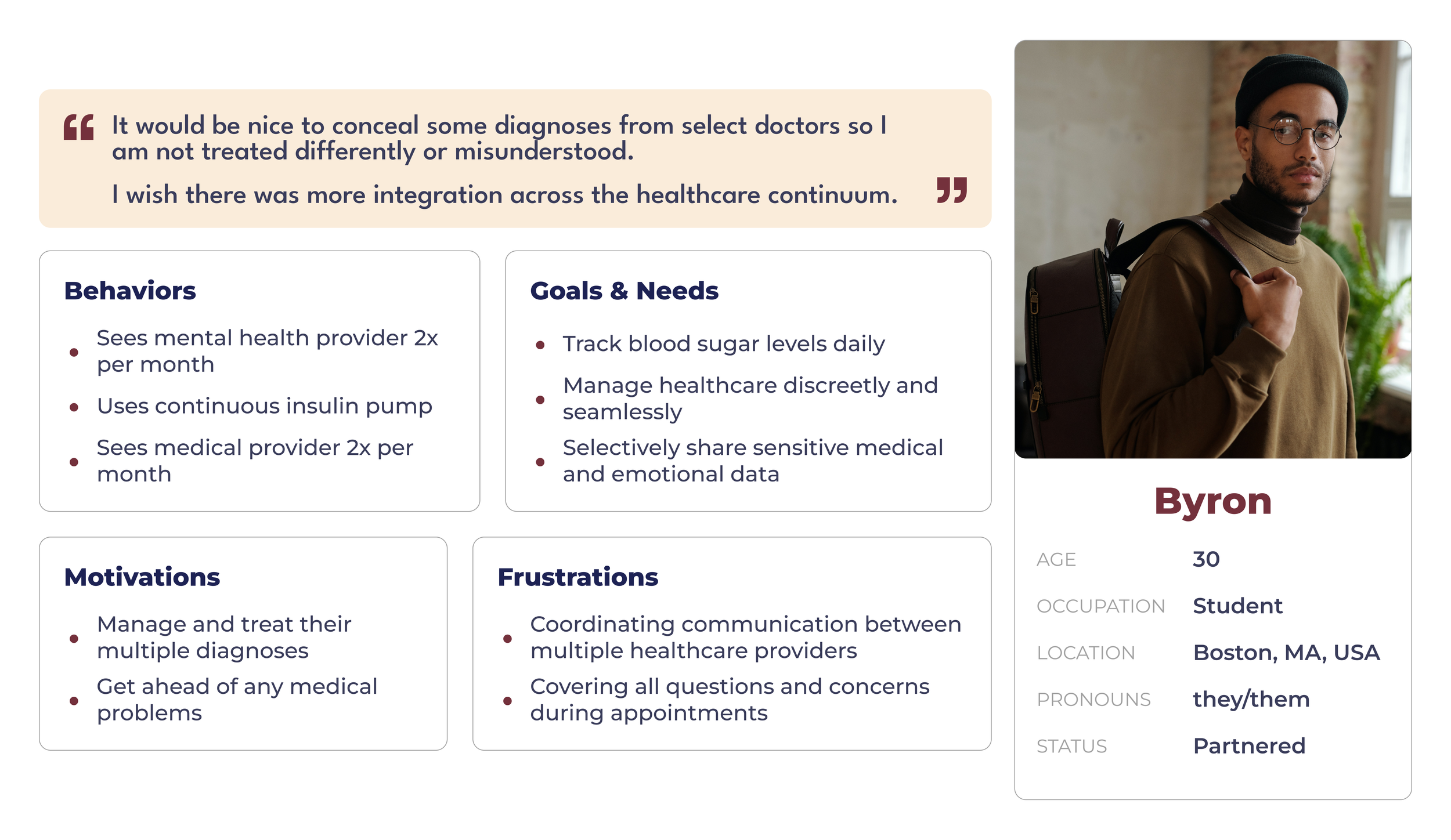 Philippa, with her desire to record, observe and quantify her exercise and behavior and Byron, with their need to coordinate with providers across the healthcare continuum, encapsulate these insights, respectively.