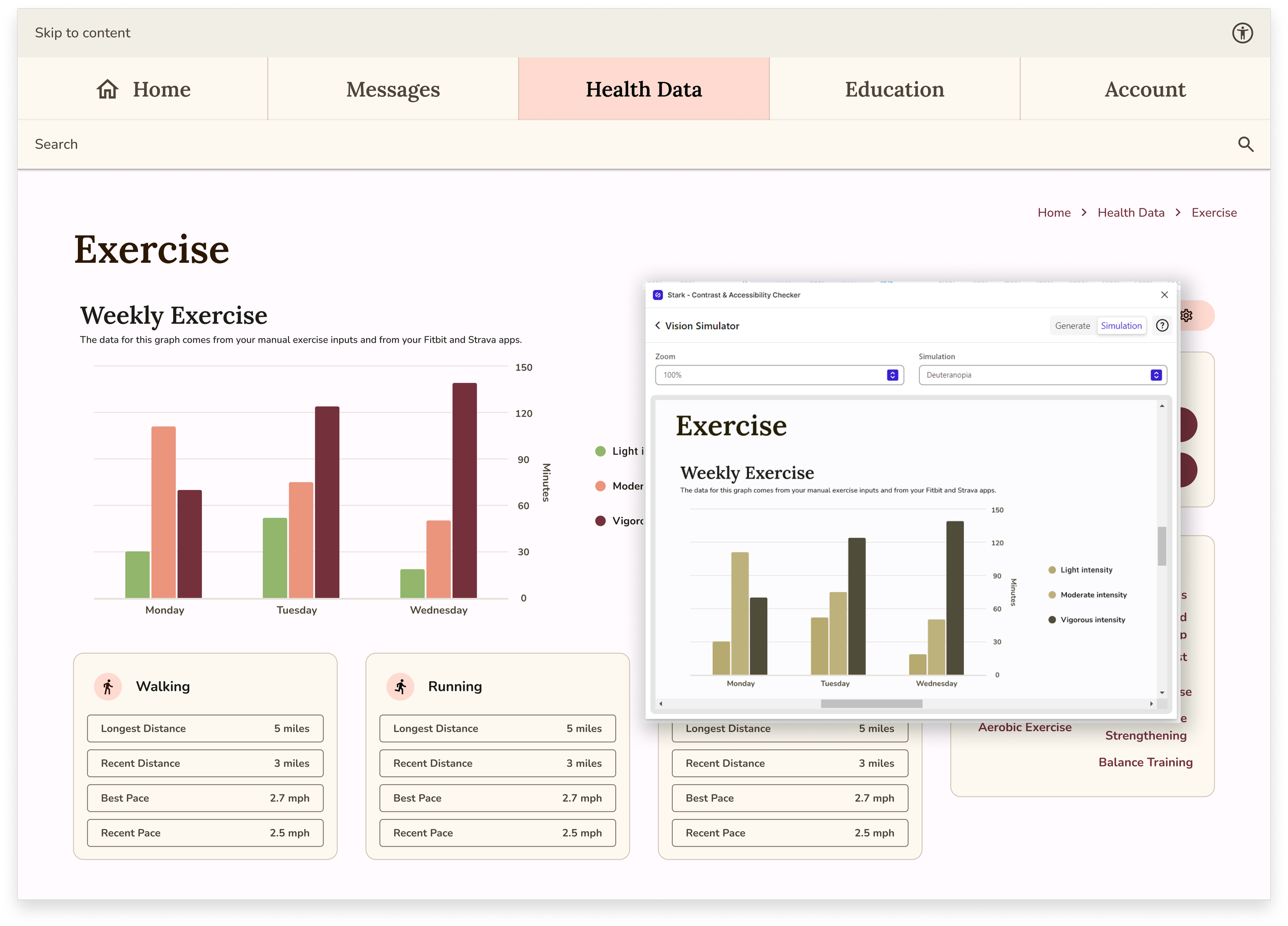 The lines and bars of Olive’s charts were difficult to tell apart, especially for those with deuteranopia.
